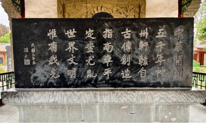 碑文内容是:“中华开国五千年,神州轩辕自古传;创造指南车,平定蚩尤乱;世界文明,唯有我先。”赞词中,他以豪迈之情讴歌了中华民族五千年灿烂文化和轩辕黄帝丰功伟绩,字里行间尽是激扬着的民族自豪感。