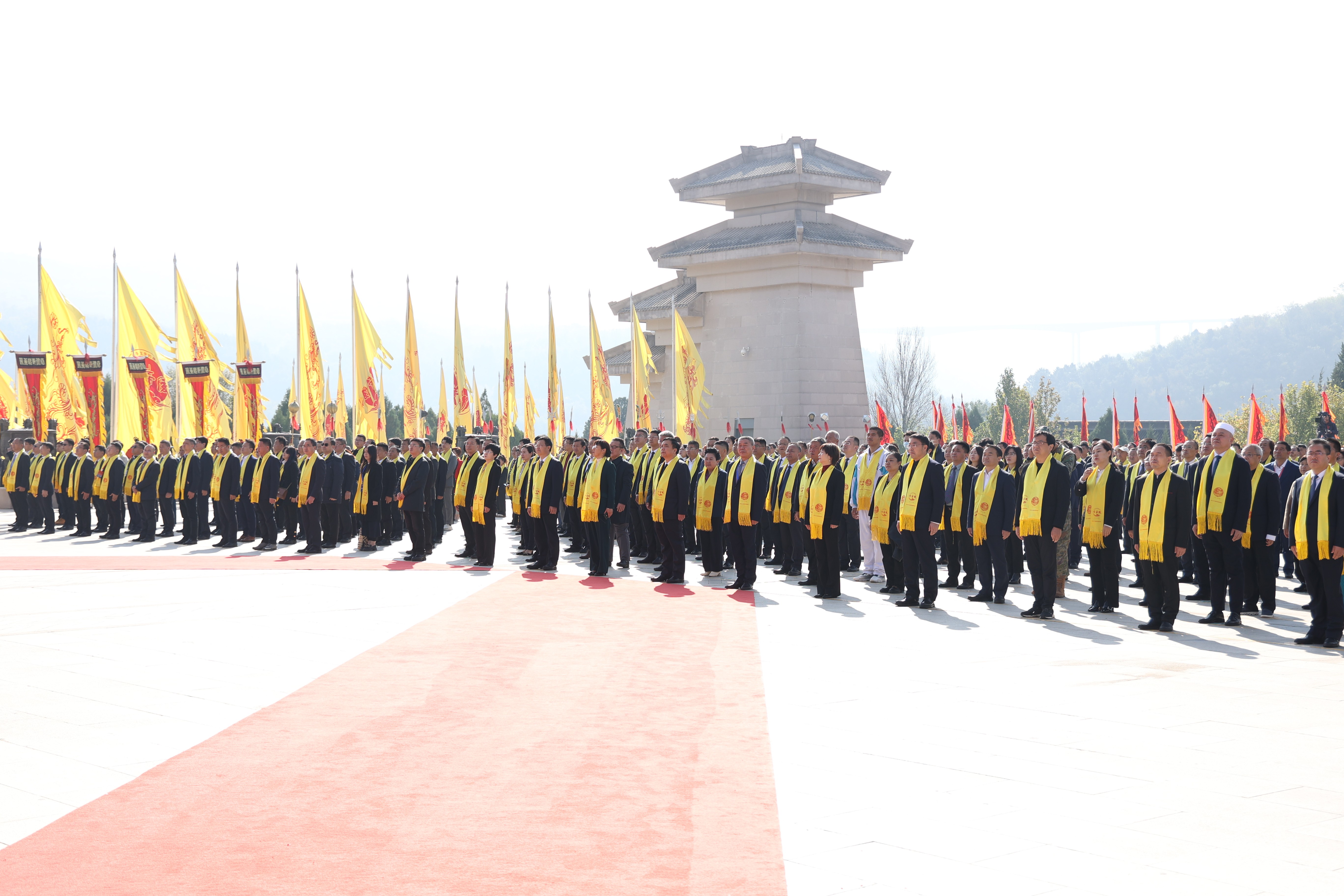 桥山永翠、古柏常青,炎黄子孙同叙华夏情。来自社会各界的参祭代表,在仪仗队的引领下,至诚至虔,沿轩辕桥、龙尾道,至轩辕广场前。随后,各方代表前往指定区域列队肃立。