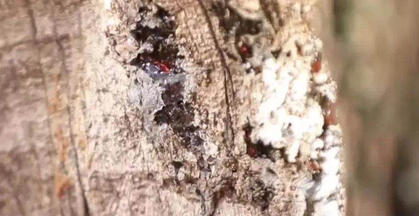 这棵树叫挂甲柏,当时汉武帝就把他的盔甲挂倒这棵树上,盔甲上的铆钉就给这棵树上留下了斑斑钉痕,所以可以看到这棵树上有一排一排非常整齐的钉痕。